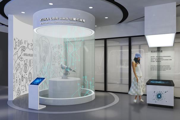 “企業(yè)數(shù)字化”、“騰飛未來”等板塊,展廳主要通過搭建多個場景還原訊飛產(chǎn)品在現(xiàn)代生產(chǎn)生活中的應(yīng)用,同時通過互動觸摸屏、物體識別桌、機(jī)械臂、VR等創(chuàng)意性展項(xiàng),將訊飛企業(yè)理念、產(chǎn)品核心賣點(diǎn)與展項(xiàng)及場景相融合,智能化的展項(xiàng)與科技風(fēng)的空間風(fēng)格既凸顯了科大訊飛企業(yè)智能化的特點(diǎn),同時也助力展示企業(yè)的核心優(yōu)勢與價值理念。